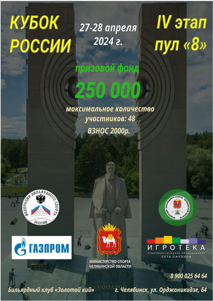 С 26 по 29 апреля (даты заезда и отъезда) в Челябинске впервые после очень большого перерыва пройдет Кубок России по пулу. Ограниченное количество участников - 48 обусловлено количеством столов. Регистрация начнется в пятницу 26 апреля, а матчи стартуют утром 27 апреля.