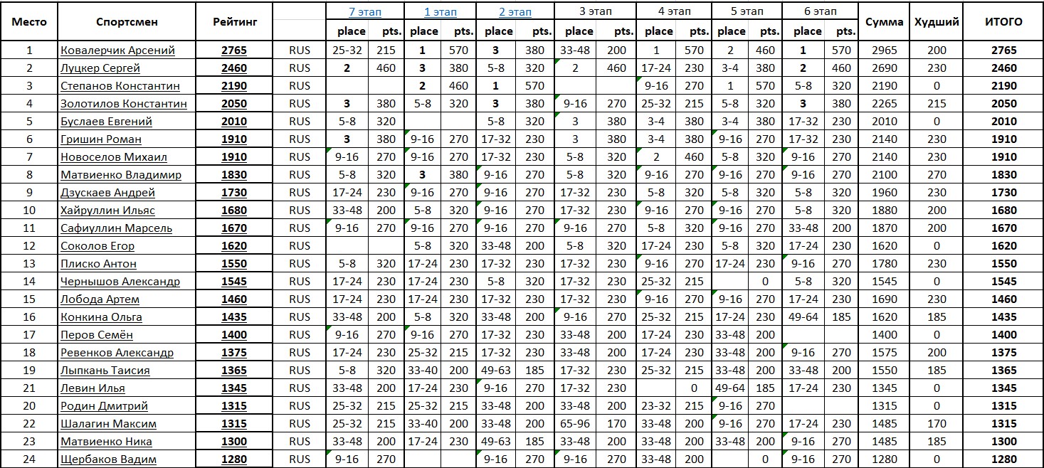 12-13 ноября пройдет 7 этап взрослого Кубка России. Для него рейтинг пока ведется вручную и первые 24 позиции на фото ниже.